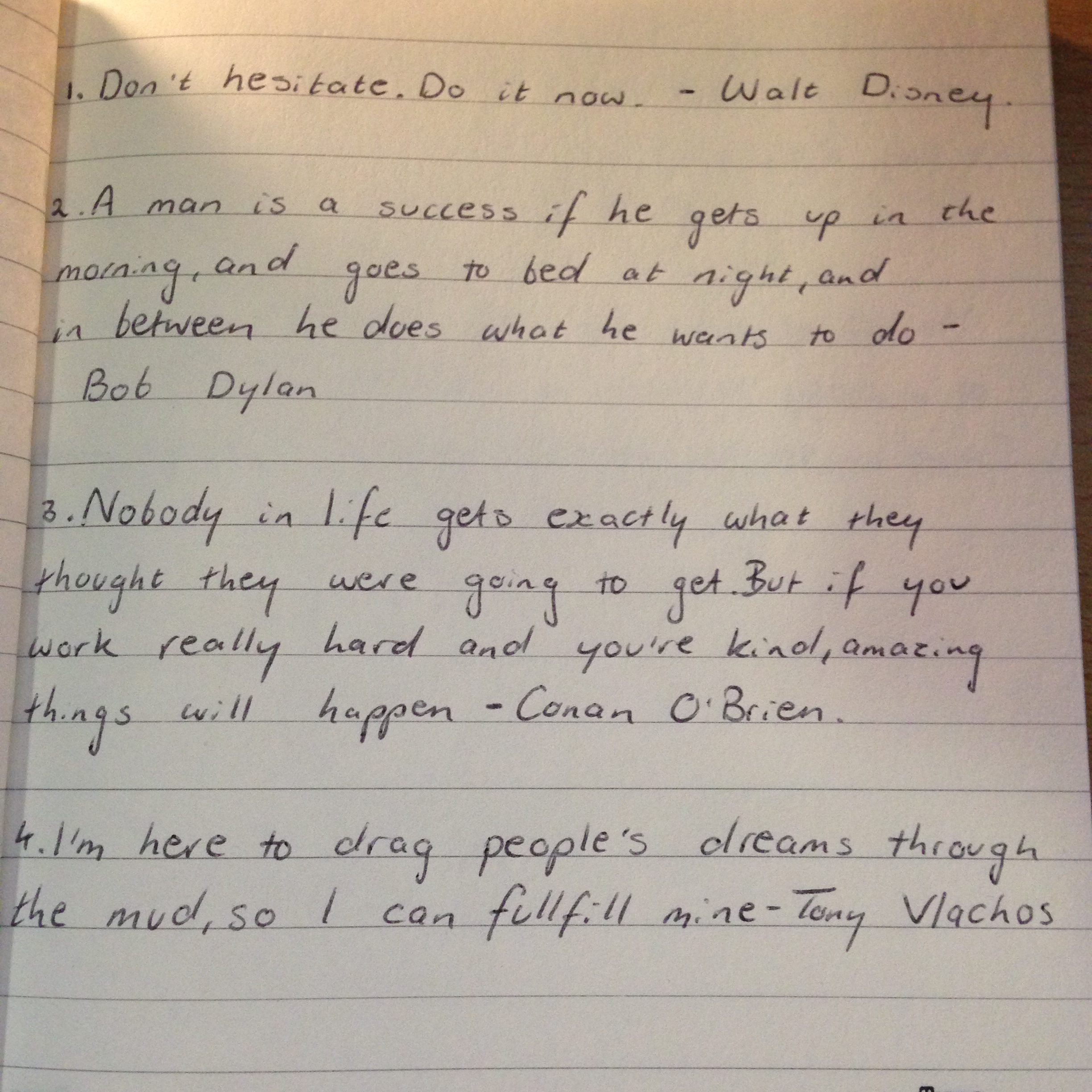 So here are the first four quotes of my new quote book, all from four hard working men. (I now realise that the first page all referencing men might be a bad reflection on my. Don’t worry, I love Tina Fey and Grace Helbig)