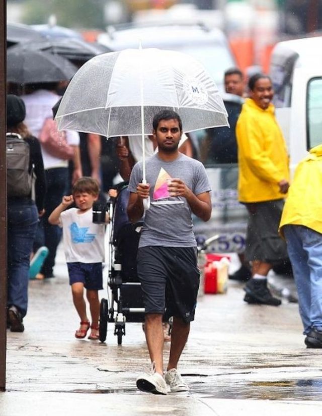 It’s a Sunday and in a attempt to amuse myself I’ve gone shopping. There is a photo taken of Aziz Ansari walking with a large clear umbrella, and holding a ice cream cone with three scoops in the other. All eyes are on him. He has the attention, but nobody to share the ice cream with. I feel like him right now, although the attention isn’t on me. I feel like it is though. There is something sad about seeing someone shopping alone, even though I know it more practical. I am carrying my bag of purchases in one hand, and I have my phone in the other. Holding my phone is very Jeff Winger of me. I hold it as though I’m seconds away from getting an important call. I’m not though.